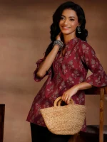 Our maroon printed cotton kurti features a mandarin notched neckline with three-quarter bell sleeves. Elevated with ethnic motifs print, this style is perfect for casual outings.