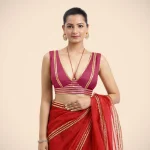 Home Blouse Sleeveless Blouse Ahana x Tyohaar | Rani Pink Sleeveless FlexiFi Saree Blouse with Plunging Neckline and Back Cut Out with Tasteful Golden Gota Lace Embellishment