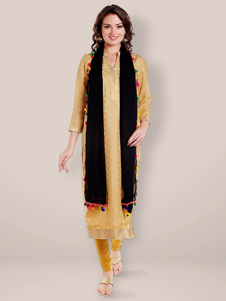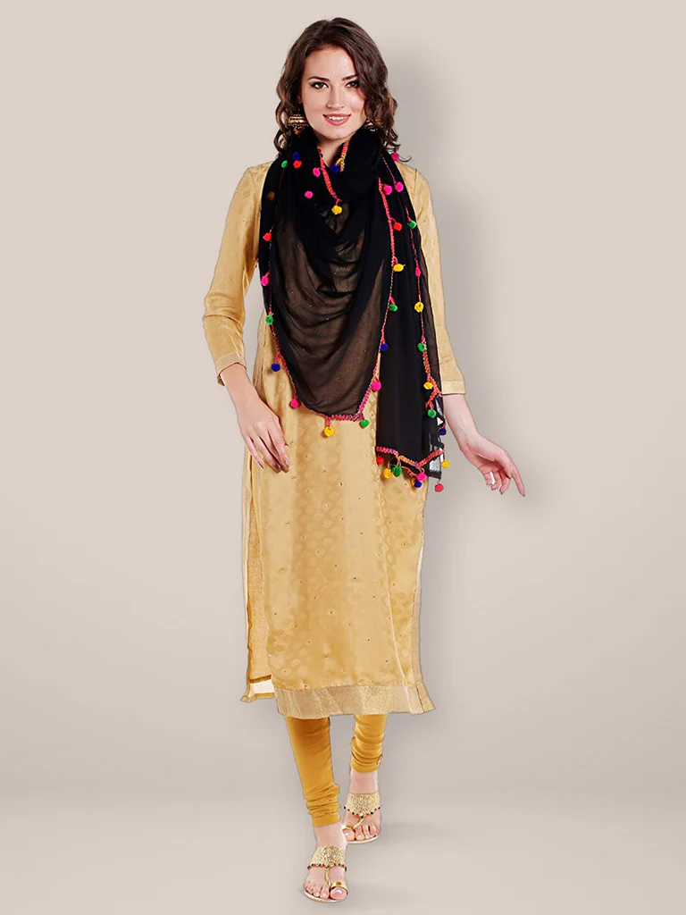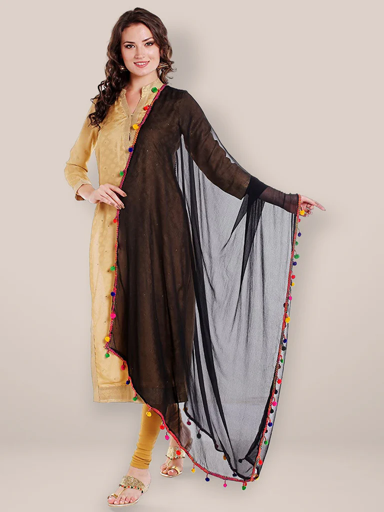 Add a touch of elegance to your wardrobe with this exquisite chiffon Dupatta. Swathed in charming, colourful pompom balls, this stunner is a must-have in your collection. Drape it around a solid or printed kurta, kurti, top or a skirt to give a touch of charismatic splendour to your ethnic diva look!