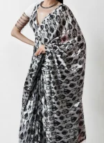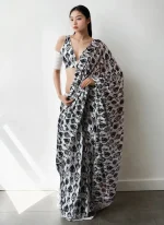 • The blouse is made from matching black and white chinon fabric and carries the same digital motif to ensure visual continuity. It features a V neckline at the front and back as shown in the image. The blouse is styled with a low front and a very low back and remains sleeveless offering a sharp and modern profile. The clean cut of the blouse complements the bold design of the saree while maintaining a refined silhouette.