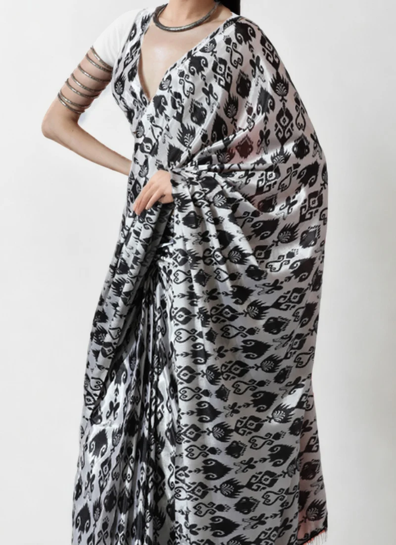 • The black and white chinon pre draped saree presents a striking contrast with its digital ikat inspired print arranged in rhythmic geometric symmetry. The abstract motifs in bold black on a soft white base create a fusion of tribal and contemporary aesthetics. The glossy finish and smooth drape of the chinon fabric add elegance and fluid movement to this visually dynamic piece.