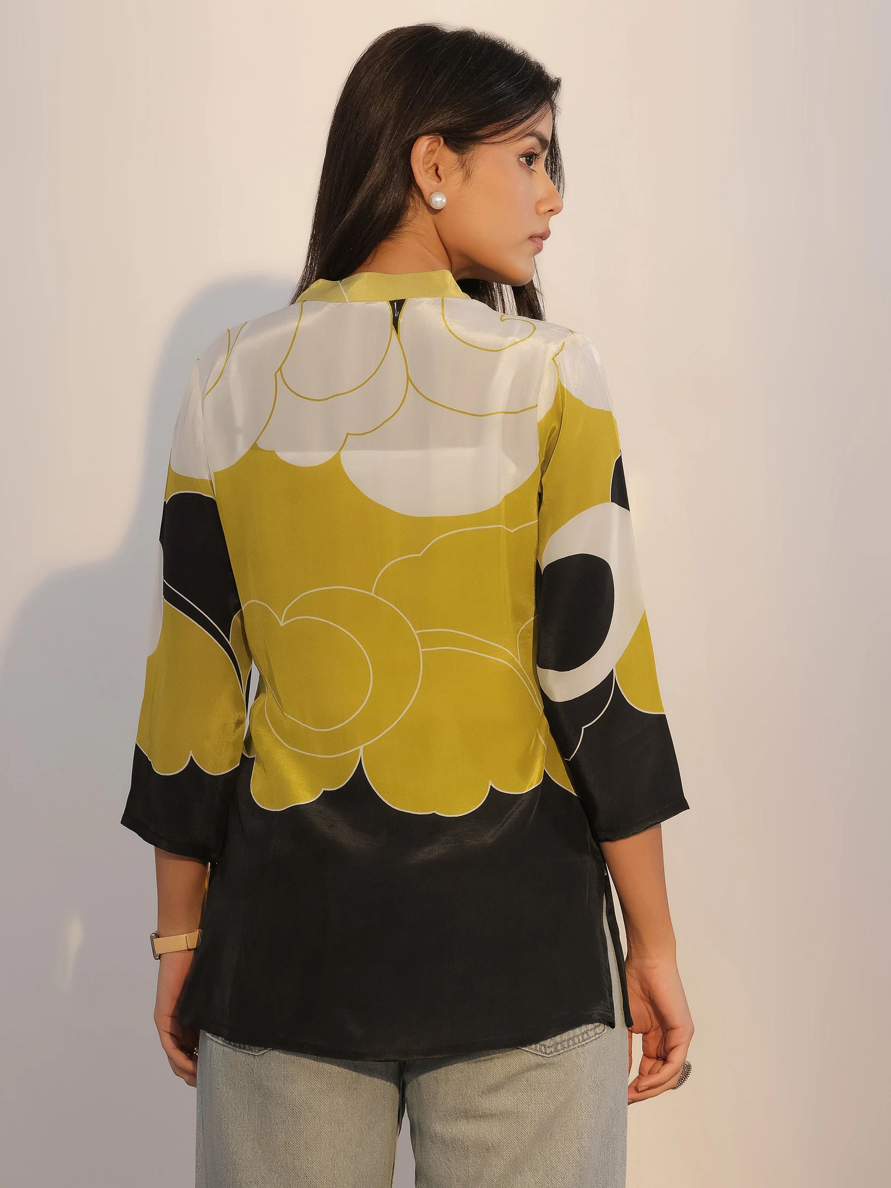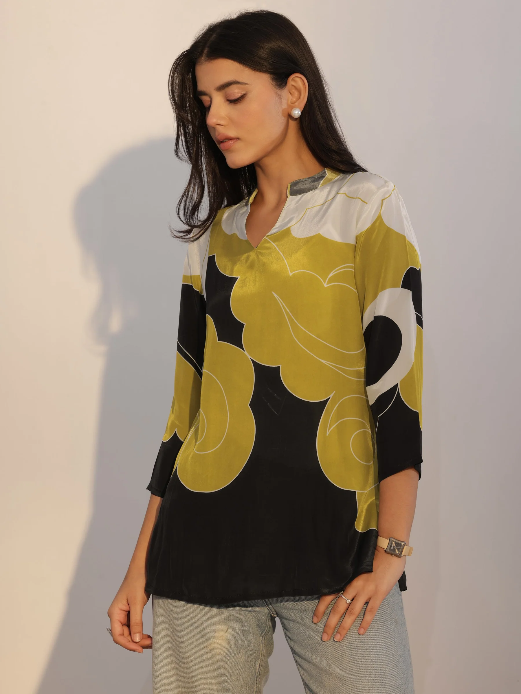 Our black printed silk blend tunic features a mandarin-notched neckline and three-quarter sleeves. Elevated with abstract prints, this style is ideal for casual outings.