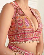 Pink Georgette Embroidered Halter Blouse Embellished With Multicolored Thread, Golden Zari And Sequins Work Ends with Dangling Beads On Waist.