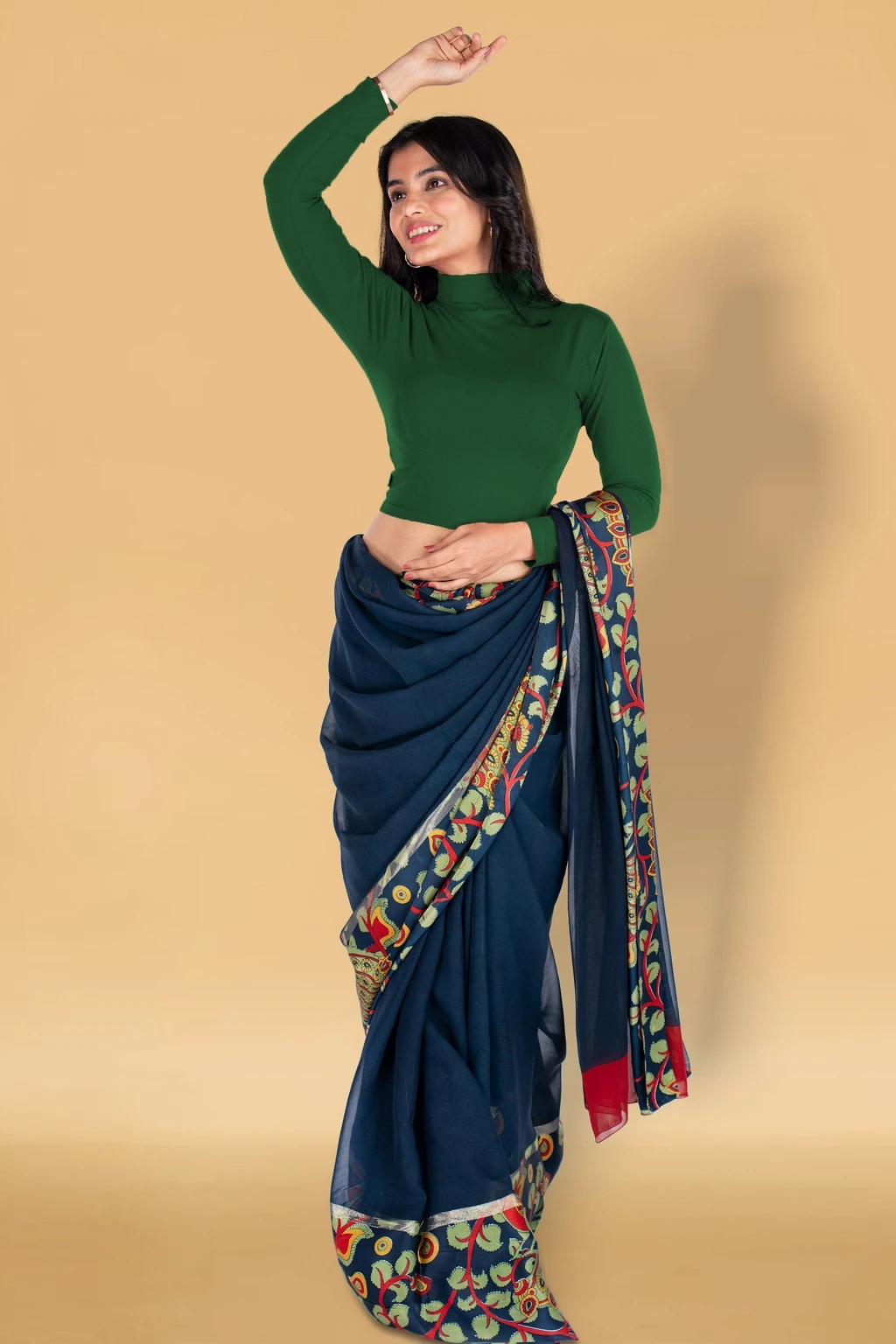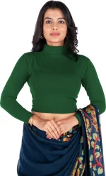 Elevate your ethnic style with this elegant high-neck cropped blouse, designed to pair perfectly with sarees, lehengas, and skirts. Crafted from soft, stretchable fabric, this blouse offersa snug yet comfortable fit that enhances your silhouette. The full sleeves and modern high neckline add a contemporary touch while maintaining a classy ethnic appeal. Ideal for festive occasions, parties, office wear, and casual ethnicstyling, this versatile blouse is a must-have wardrobe essential. The smooth finish and rich, solid color make it easyto mix and match with printed or plain sarees. Note: Sareeshown in images is for styling purposes only and is not included.