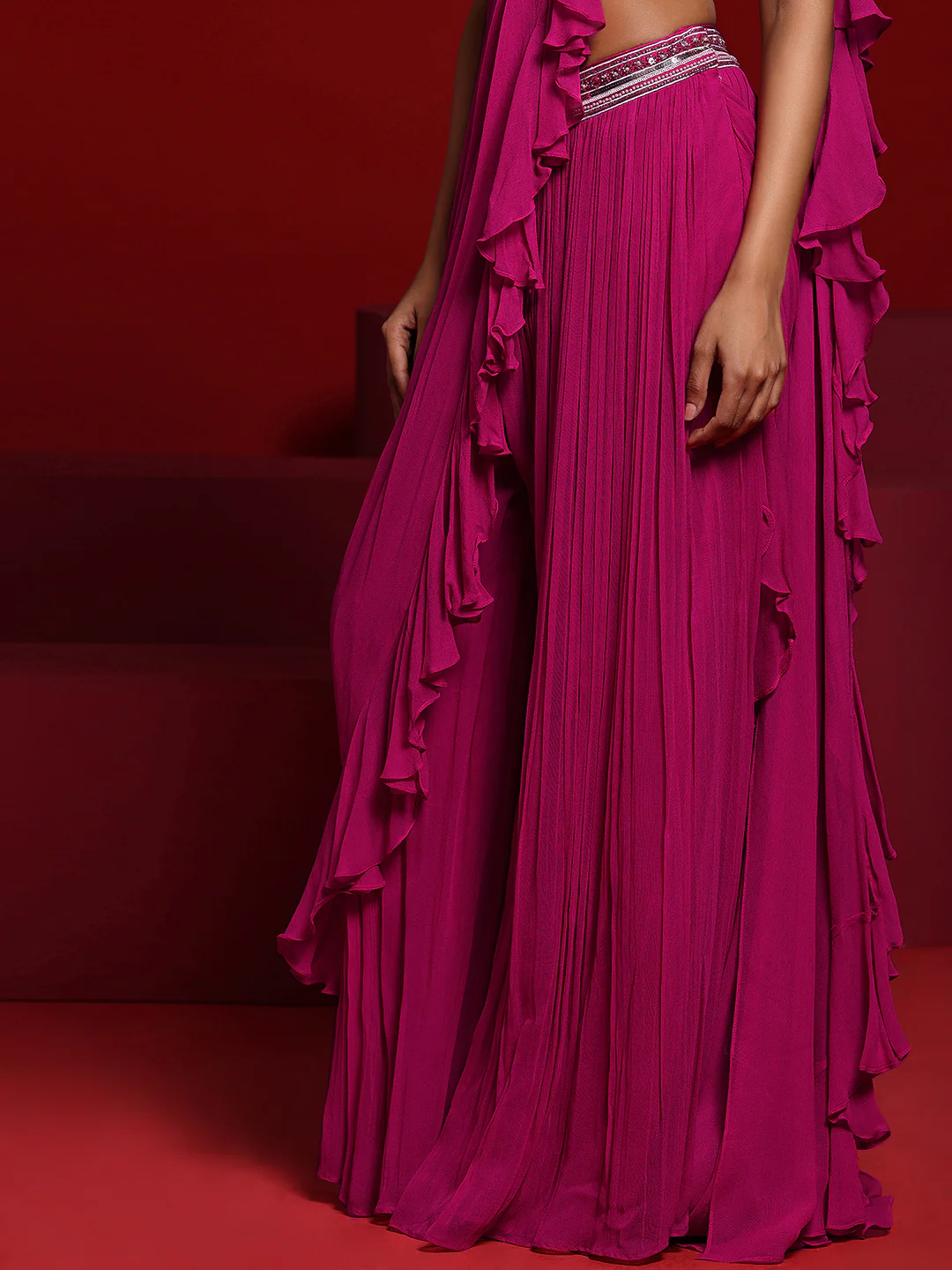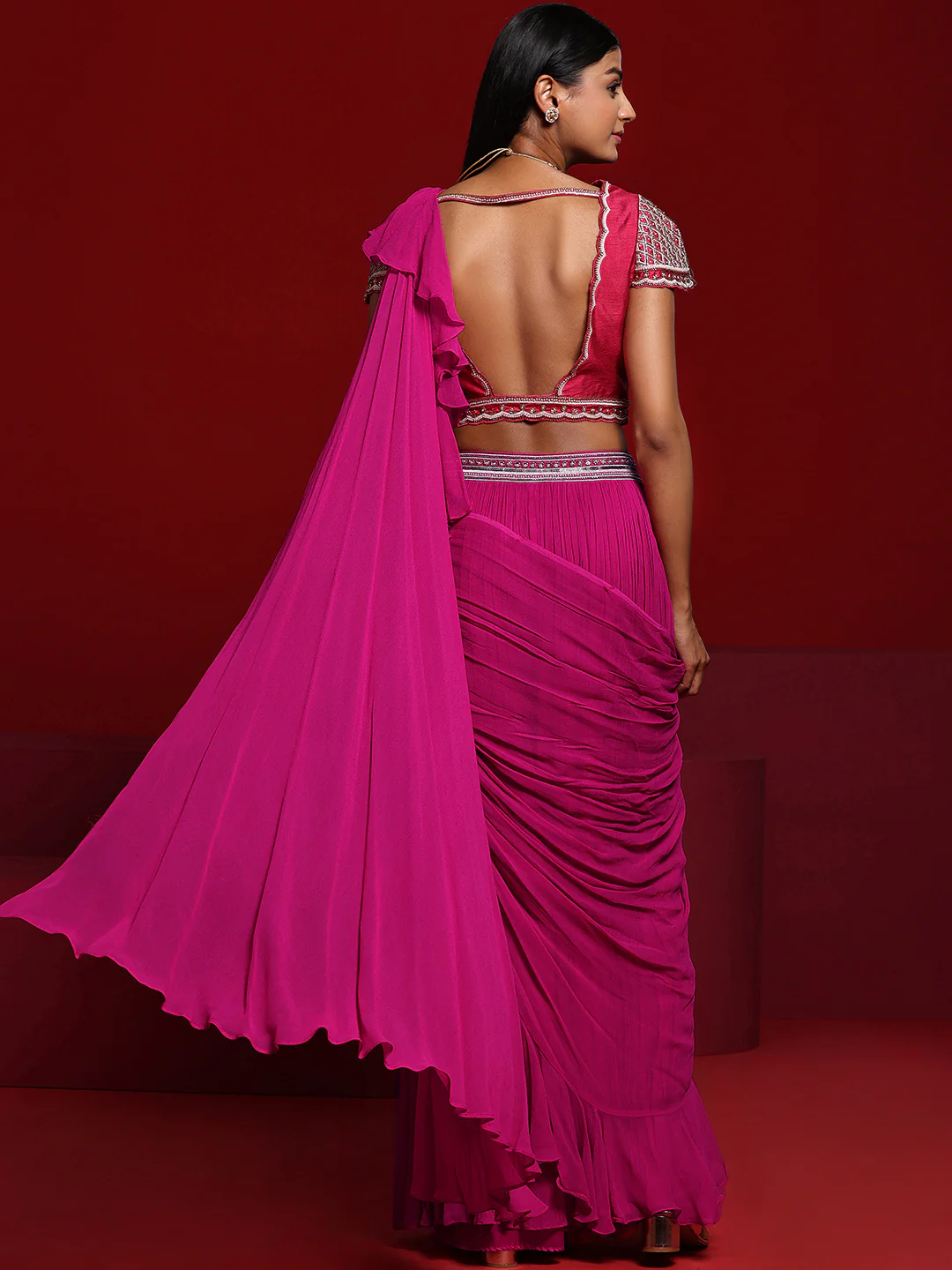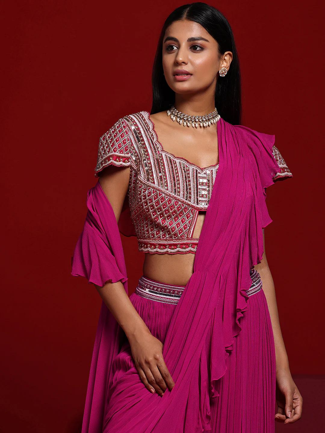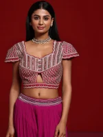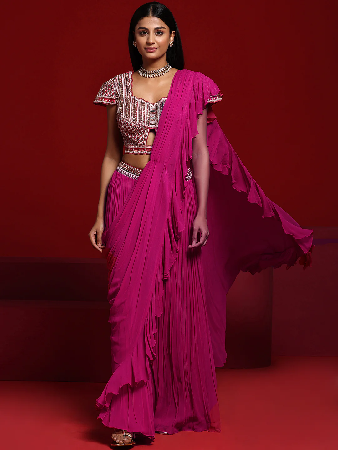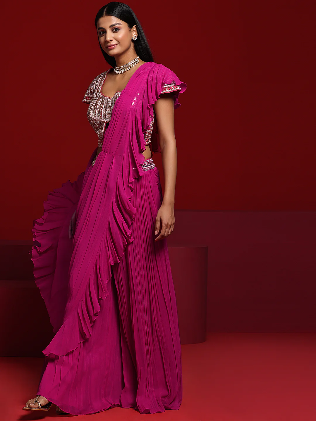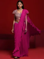 Our pink ruffled saree is crafted in sumptuous silk-blend fabric and features a short-sleeved blouse with a sweetheart neckline. Adorned with beaded accents and sequins, this style is perfect for festive celebrations.