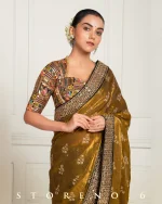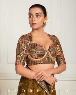Nafeeza x Tyohaar | Bronze Gold Embellished Elbow Sleeves FlexiFi Saree Blouse with Plunging V Neckline with Tasteful Golden Gota Lace