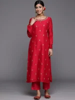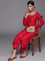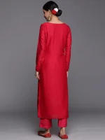 Red Embroidered Silk Blend Straight Kurta