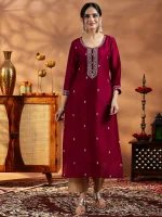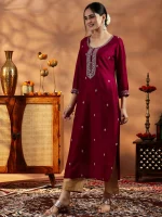 Maroon Embroidered Silk Straight Kurta