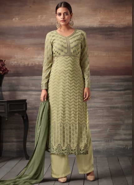 Beige Georgette Embroidered Straight Cut Suit Glamour