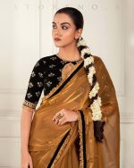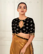 • Black Velvet Embroidered Blouse Embellished With Golden Zari And Sequins Work,Adding Black And Golden Border And Beads.