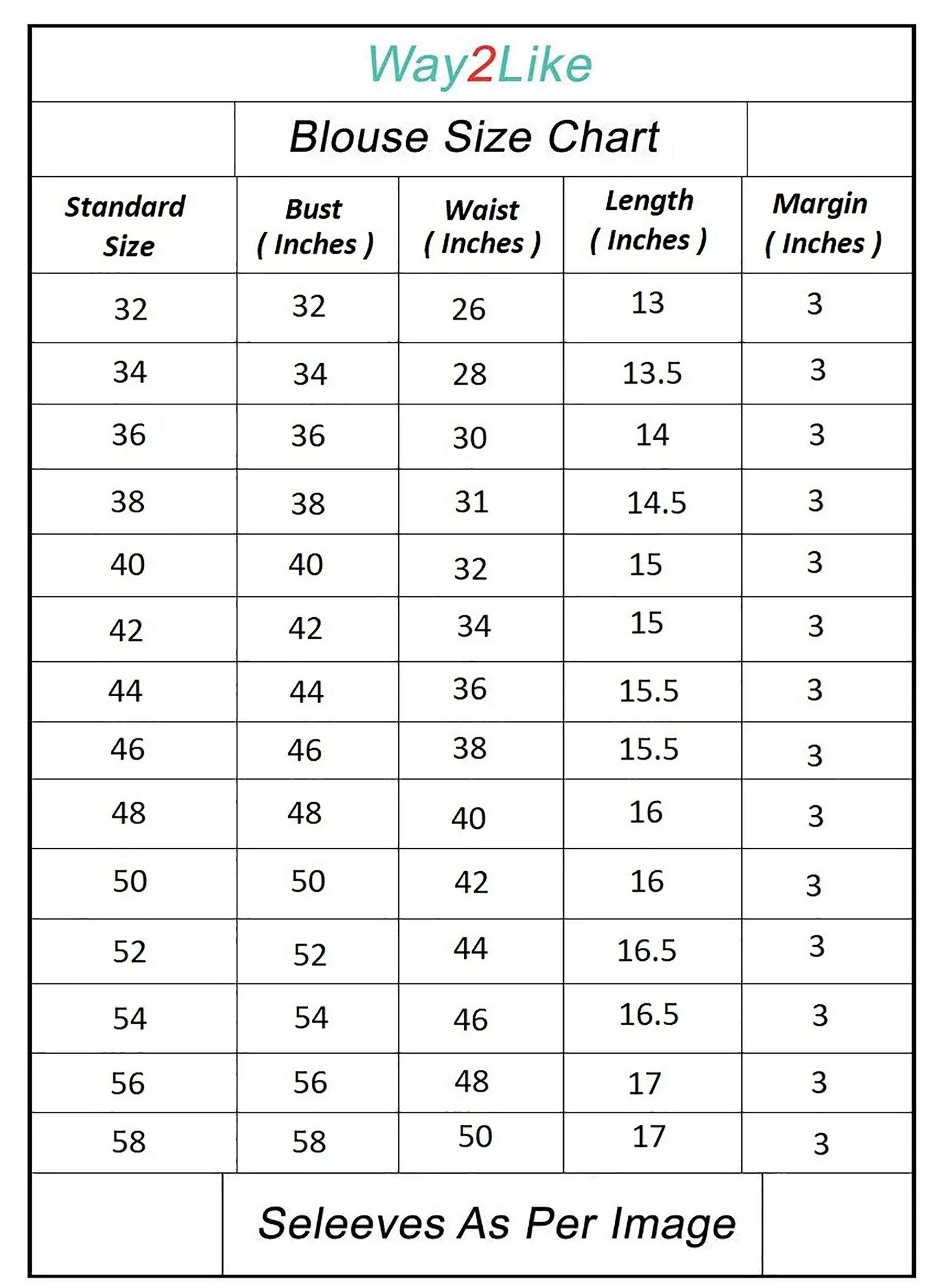 Bust-32, Bust-34, Bust-36, Bust-38, Bust-40, Bust-42