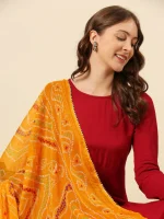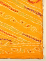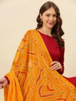 - Adorn yourself with this very fine chiffon dupatta featuring vibrant Bandhini print all over. Wrap around this astounding piece and grace your favorite occasion