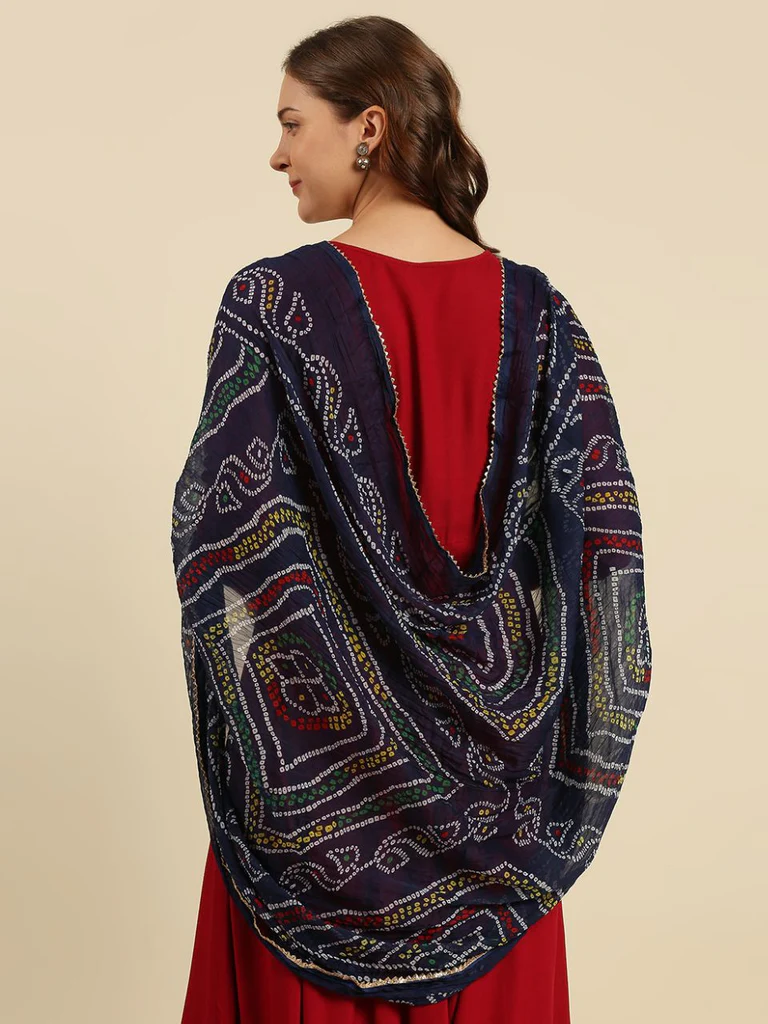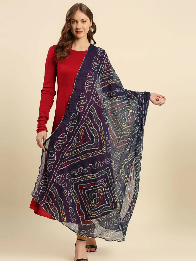 Give a touch of charismatic splendour to your ethnic silhouette with this gorgeous chiffon dupatta in a pretty hue. Adorned with beautiful bandhini print and delicate border on edges underlining pure feminine sophistication, this beautiful creation can be flaunted at the next cultural meet with a contrast kurti, matched bottom, and classy platforms.