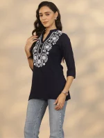 Navy Blue Yoke Design Rayon Straight Short Kurti