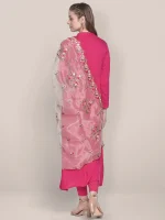 • This light weight organza dupatta is adorned with colorful embroidery all over along with scalloped borders .