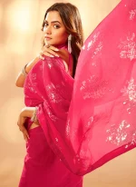 Introducing the Pink Faux Georgette Sequins Sari A Timeless Elegance Elegance grace and a touch of sparkle these are the defining features of the Pink Faux Georgette Sequins Sari. This exquisite piece of Indian ethnic attire encapsulates the rich tapestry of tradition and contemporary fashion making it a perfect choice for women who seek to embrace their cultural roots while making a bold and fashionable statement. At the heart of this sari is the sumptuous faux georgette fabric. Georgette is known for its lightweight sheer texture that drapes beautifully and feels incredibly comfortable against the skin.