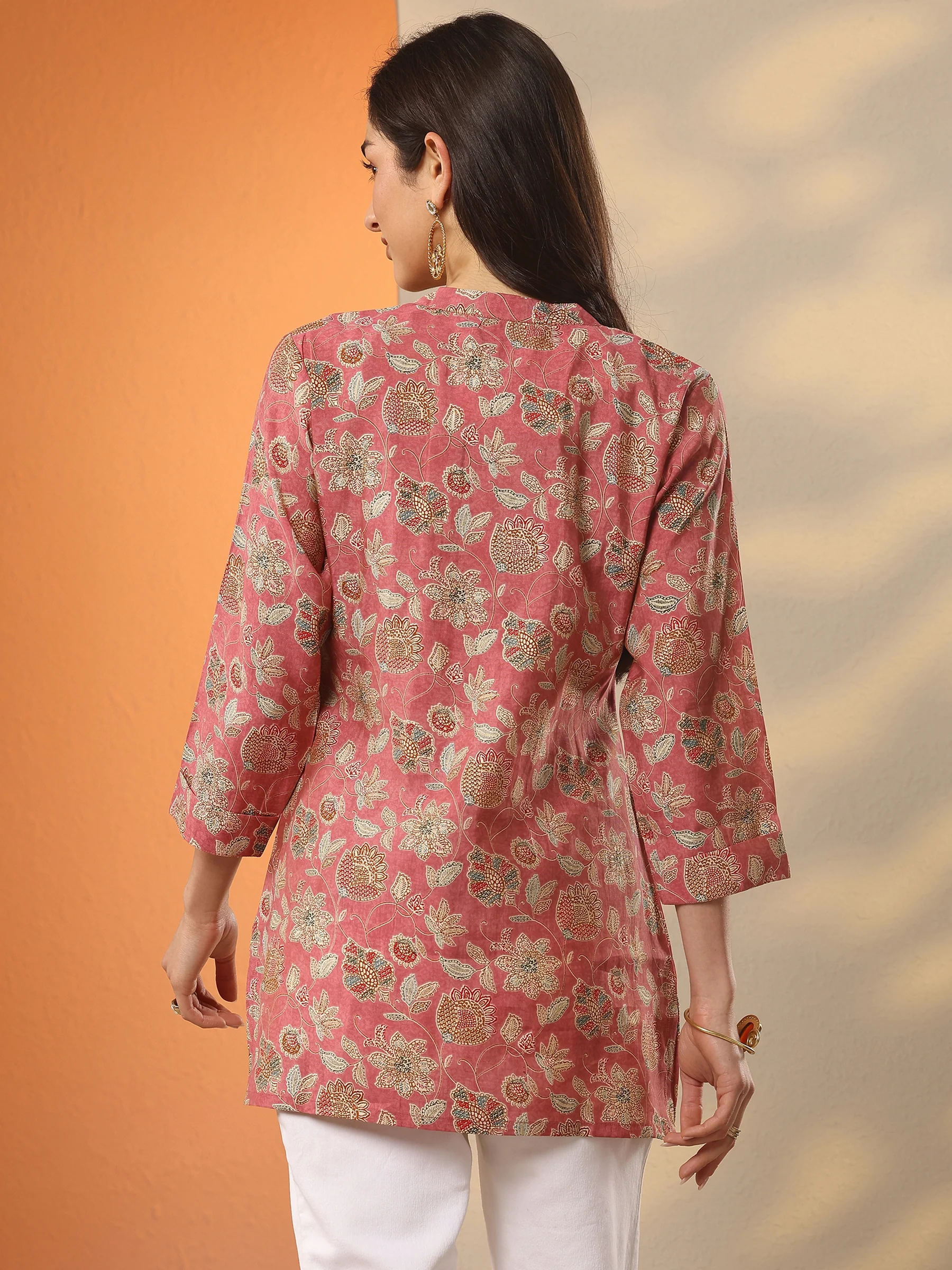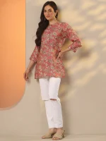 Pink Printed Silk Blend Straight Short Kurti