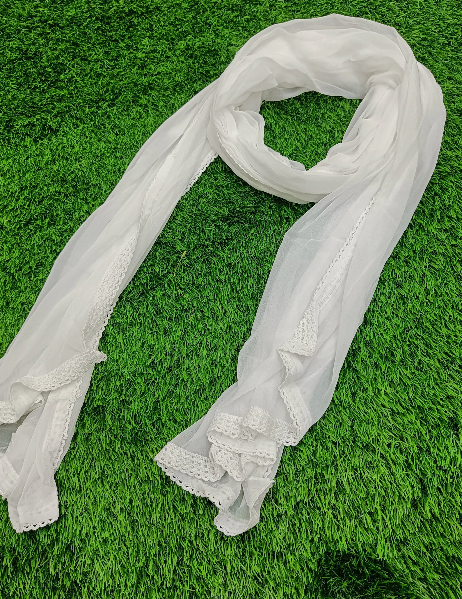 Home Dupatta Plain White Chiffon Dupatta With Crochet lace Border