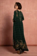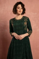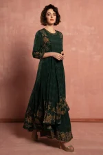 DEEP GREEN LONG HIGH LOW HEM PRINTED KURTA TOP AND PALAZZO PANTS PAIRED WITH A CONTRAST BEIGE GOLD DUPATTA AND ALL OVER GOLD EMBELLISHMENTS.