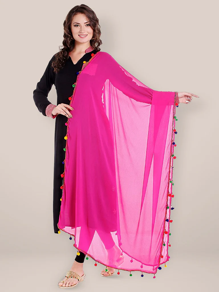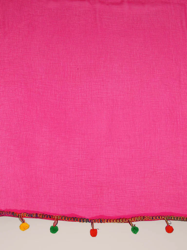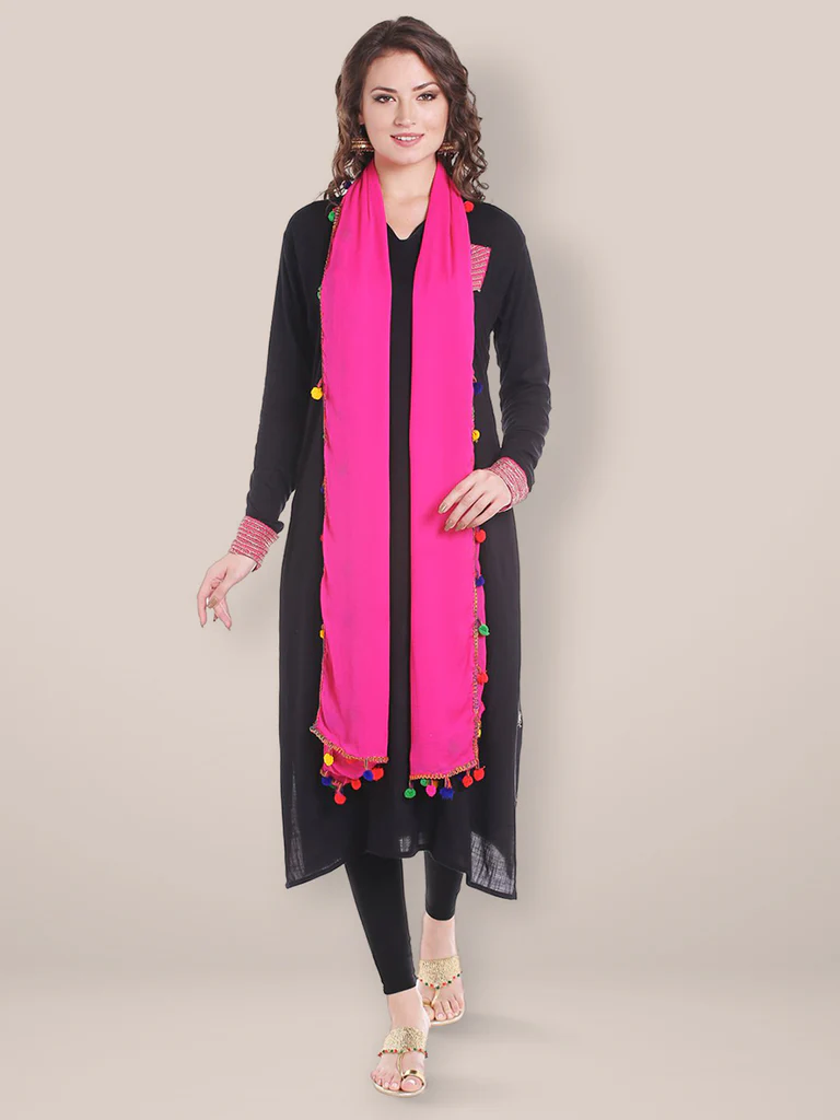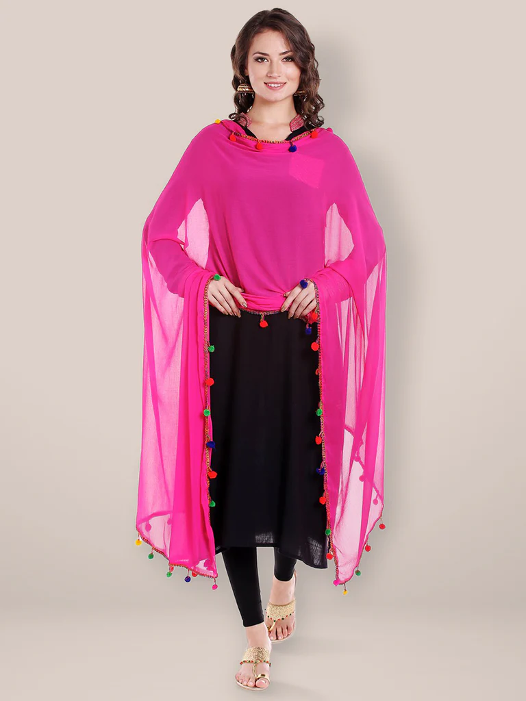 Rani Pink Chiffon Dupatta with Multicolored Pompom Balls