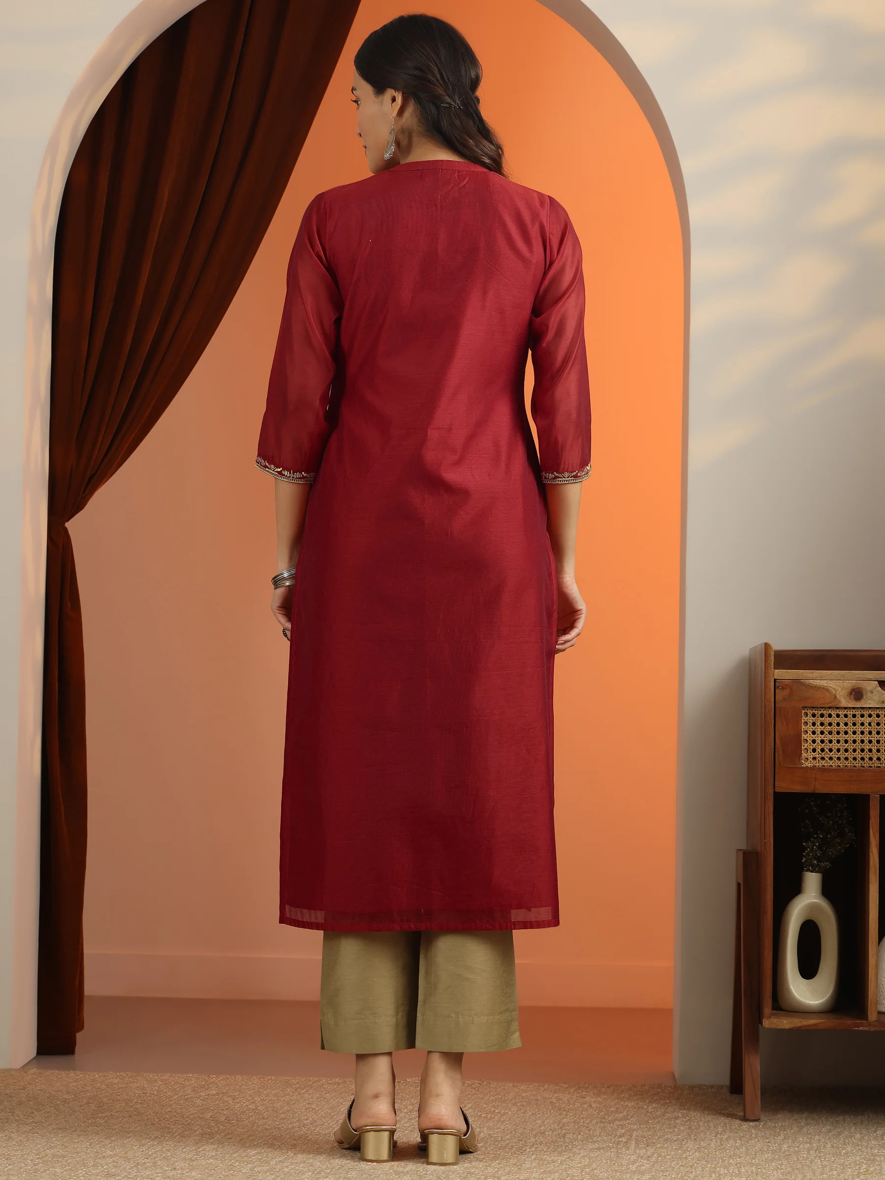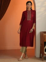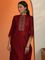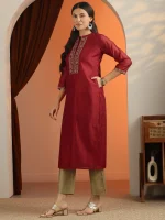 Red Embroidered Silk Blend Straight Kurta