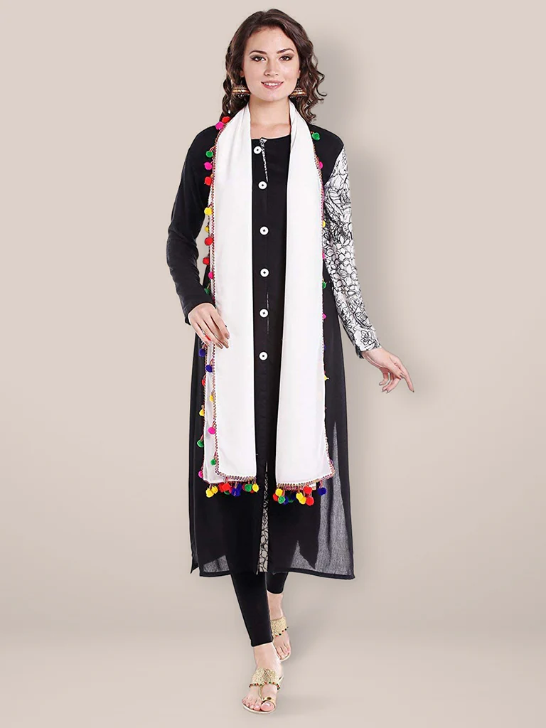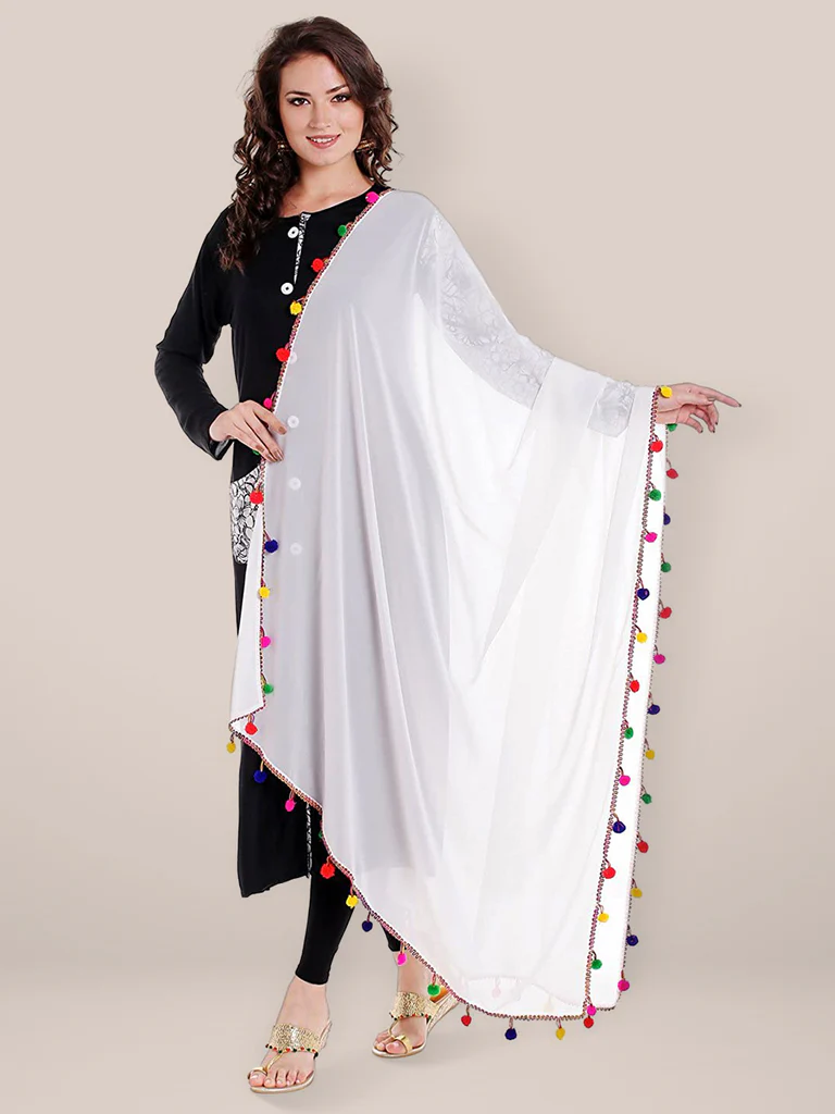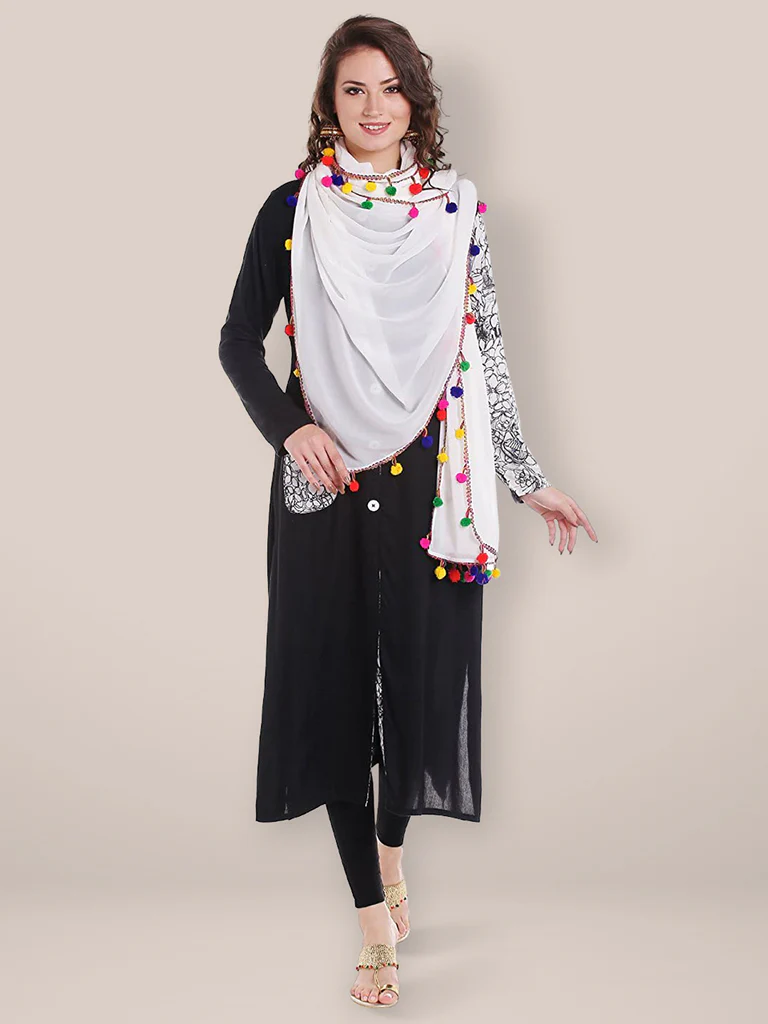 Add a touch of elegance to your wardrobe with this exquisite piece of beautiful chiffon Dupatta. Swathed with charming colourful pompom balls, this stunner is a must in your collection. Drape it around a solid or printed kurta, kurti, top or a skirt to give a touch of charismatic splendour to your ethnic diva look!