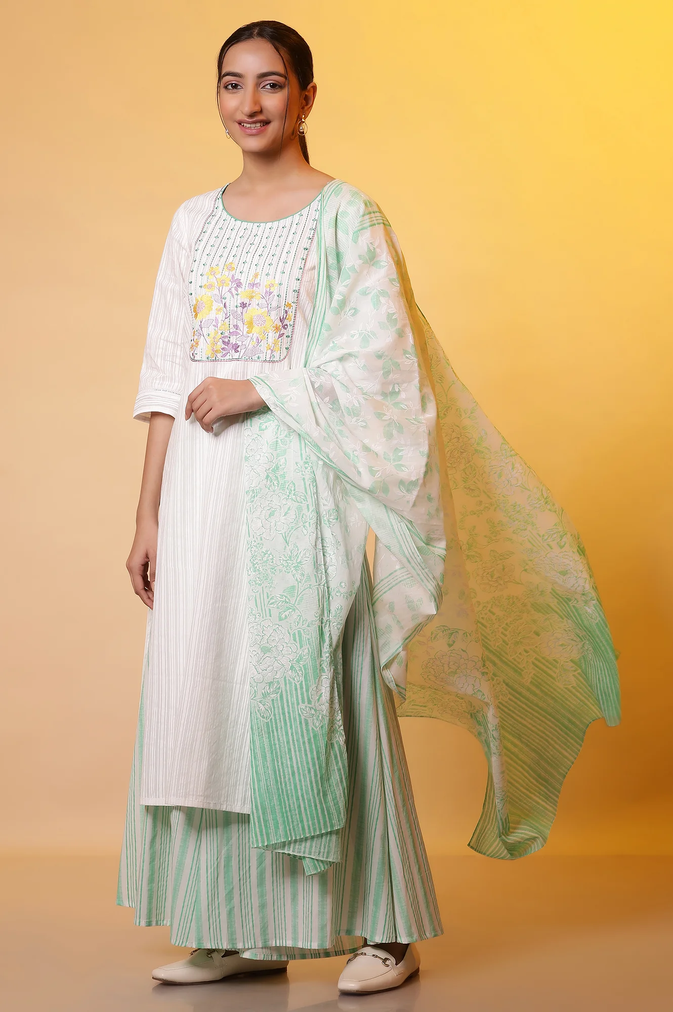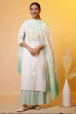 Home Dupatta White Cotton Dupatta with Green Stripes and Floral Print