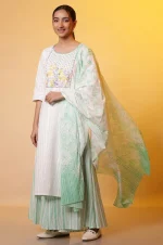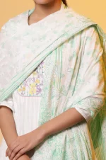 White Cotton Dupatta with Green Stripes and Floral Print