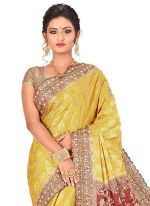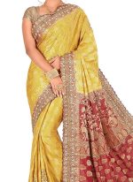 Fashion and pattern would be at the peak of your attractiveness after you dresses this yellow art silk designer kancheepuram traditional saree. The ethnic weaving and stone work in the attire adds a sign of beauty statement for your look. Comes with matching blouse.