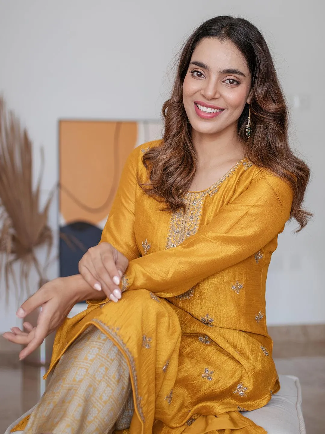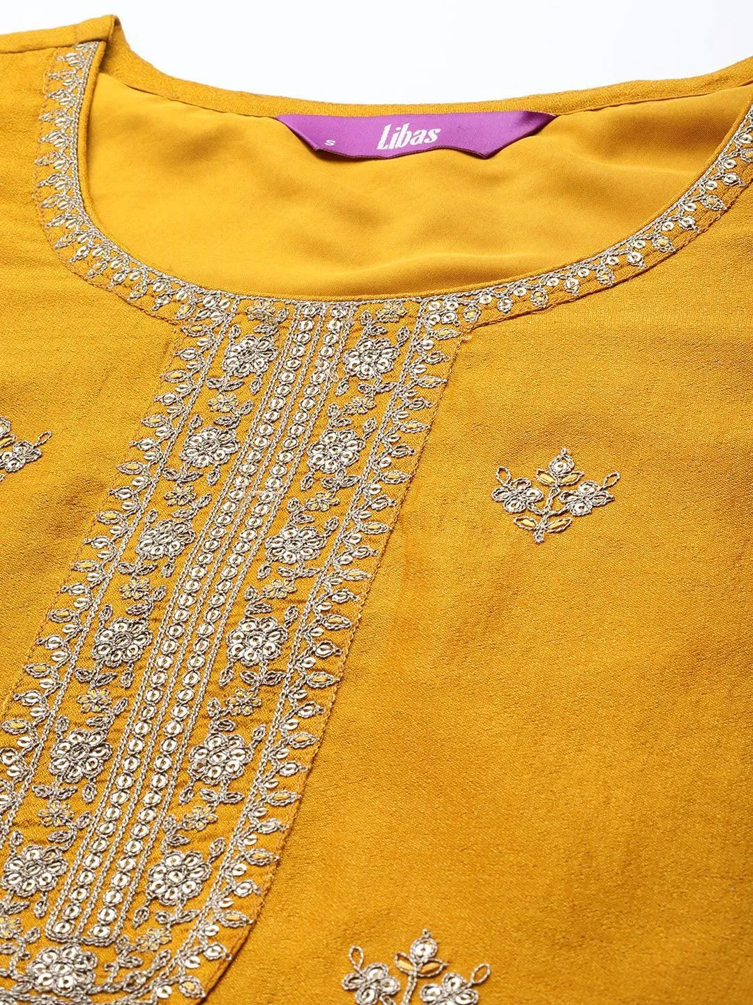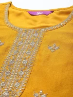 Our yellow embroidered kurta, crafted silk blend fabric, features a round neckline, comfortable full sleeves, and a statement yoke. Adorned with intricate embroidery and sequin accents, this charming style is perfect for festive celebrations.